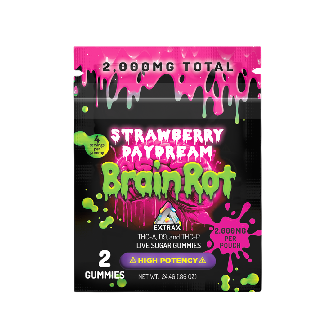 Every pack includes two massive gummies, each loaded with an impressive 1,000mg cannabinoid blend, for a total of 2,000mg per package. From the punchy flavor to the serious potency, Brain Rot is made for those who don’t settle for ordinary edibles.